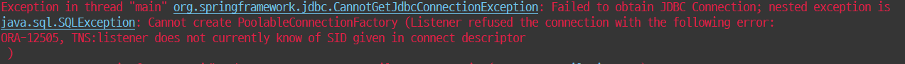 해당 에러가 뜨면 오라클 리스너 에러일 것이다. 오라클 데이터베이스 접근시 사용하고 있는 SID를 확인하면 된다.